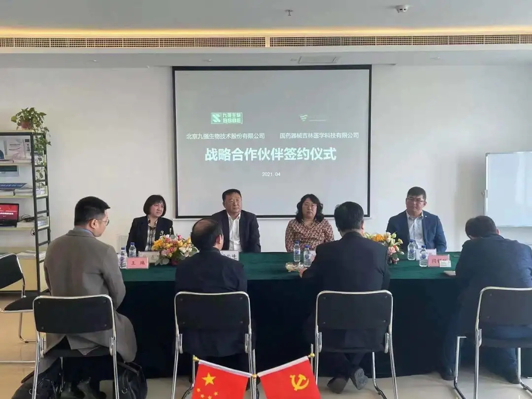 2021年4月21日,九強生物與國藥器械吉林醫學科技有限公司就九強在吉林省四平市國藥端銷售事宜簽訂了戰略合作協議,協議中明確了合作原則和目的,確定了銷售方式及供貨價格等。參會人員有:國藥器械吉林醫學科技有限公司副董事長徐險峰、總經理徐春梅、常務副總經理韓立彬、商務經理鮑鑫,九強生物董事長鄒左軍、副總周明、東北大區總監閆銘銳、吉林省區總監王禹。