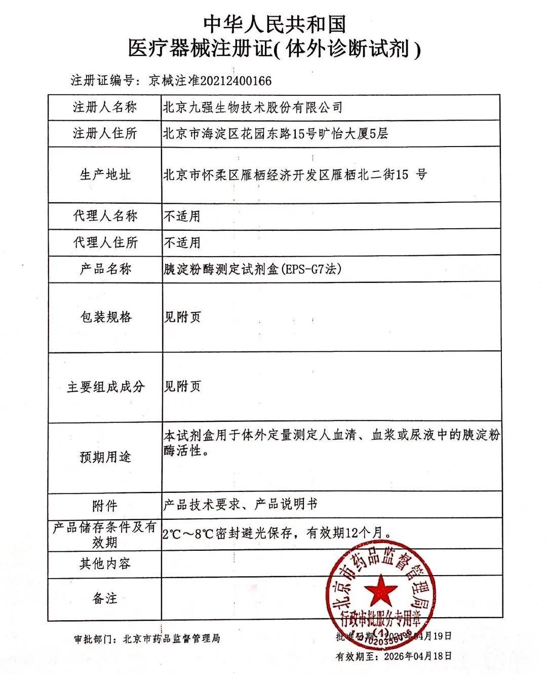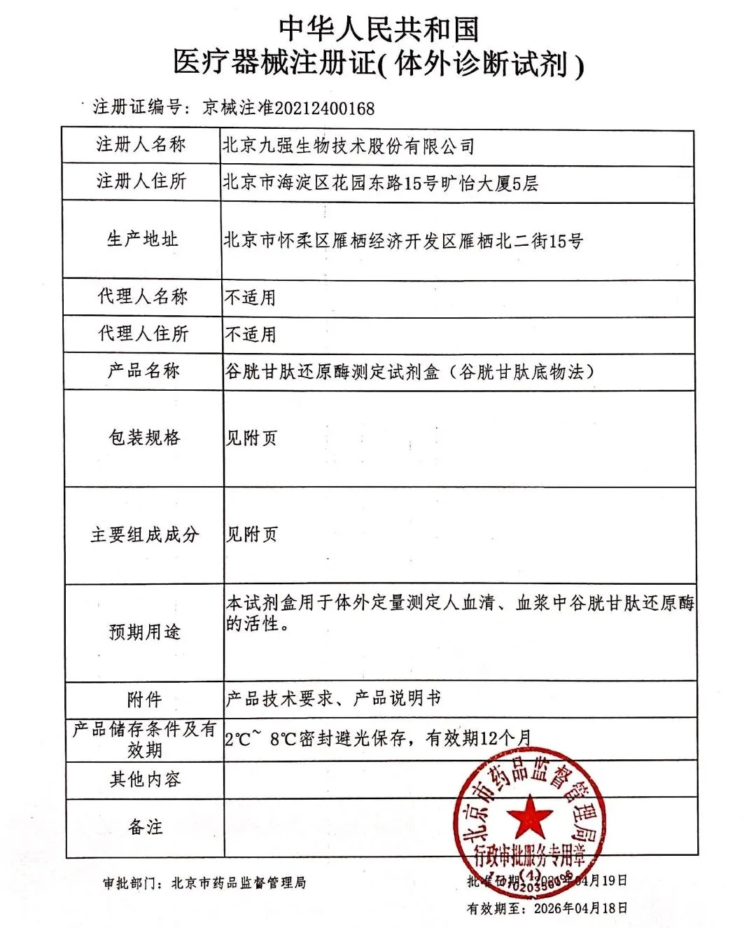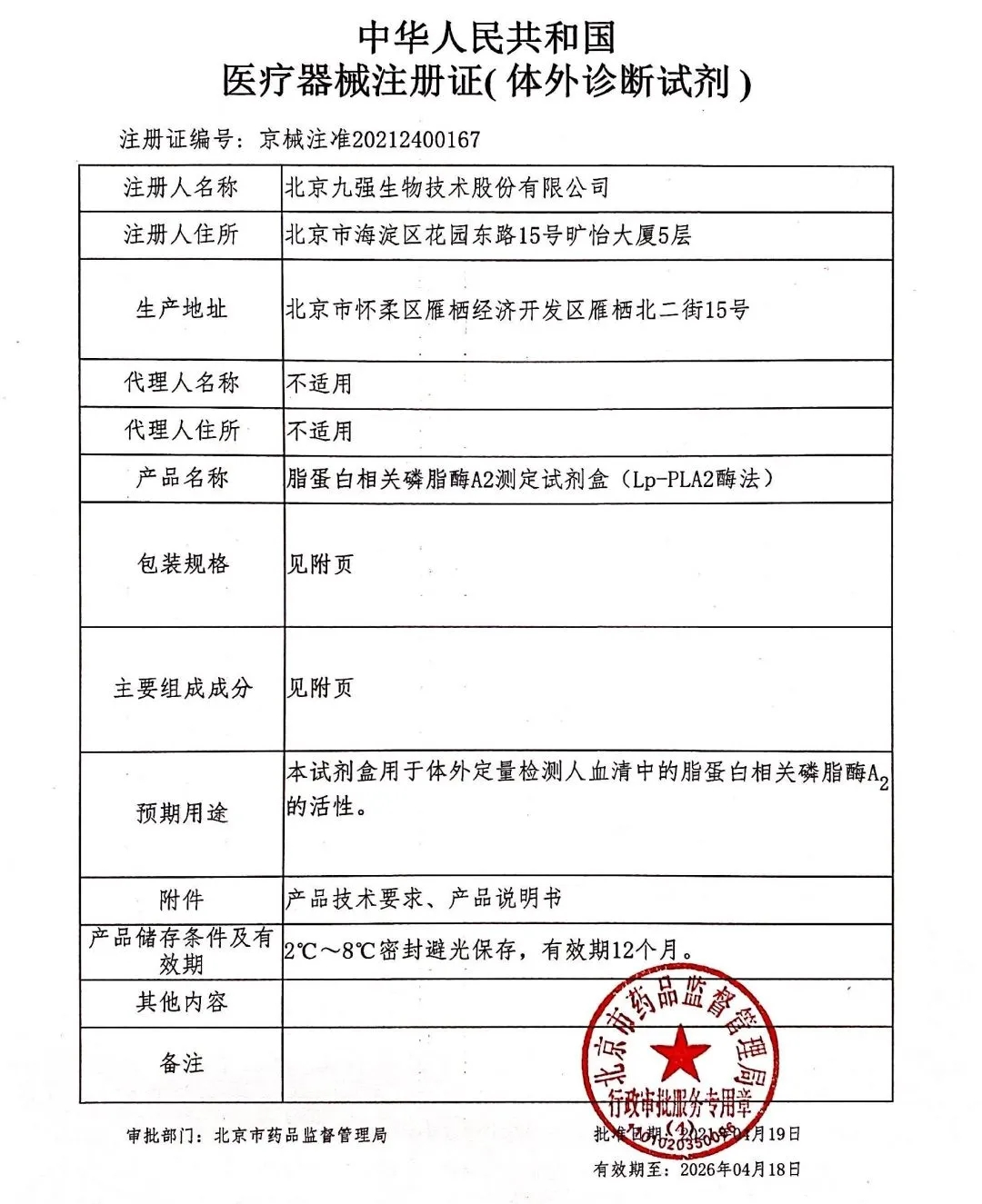 九強生物順利取得北京市藥品監督管理局頒發的三項產品的《醫療器械注冊證》:谷胱甘肽還原酶(液體)測定試劑盒(谷胱甘肽底物法)、脂蛋白相關磷脂酶A2測定試劑盒(Lp-PLA2酶法)和胰淀粉酶測定試劑盒(EPS-G7法)。