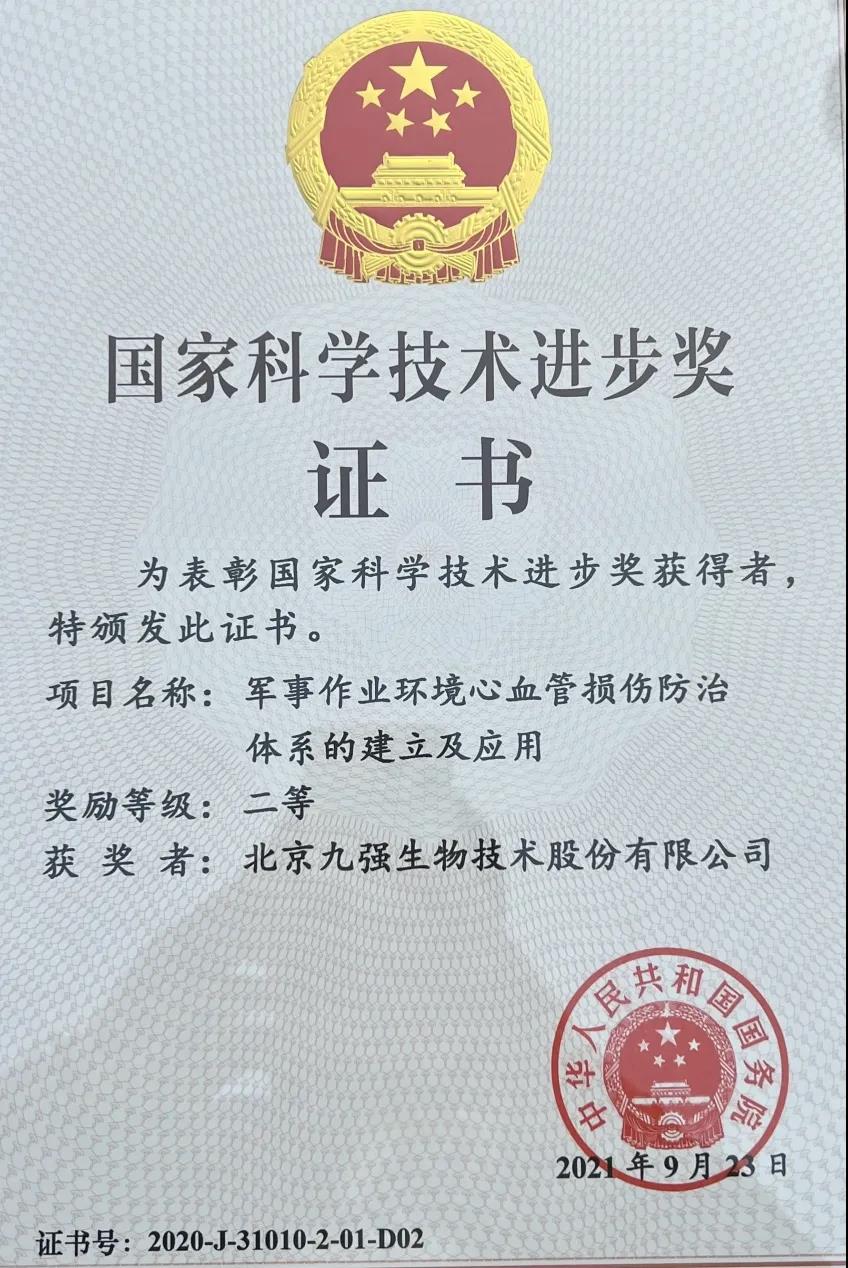 2021年11月3日,2020年度國家科學技術獎勵大會在人民大會堂正式召開。中國人民解放軍總醫院何昆侖、田亞平兩位教授團隊領銜,與北京九強生物技術股份有限公司共同合作完成的“軍事作業環境心血管損傷防治體系的建立及應用”榮獲2020年度國家科技進步二等獎。九強生物總經理劉希出席了頒獎現場并領獎。