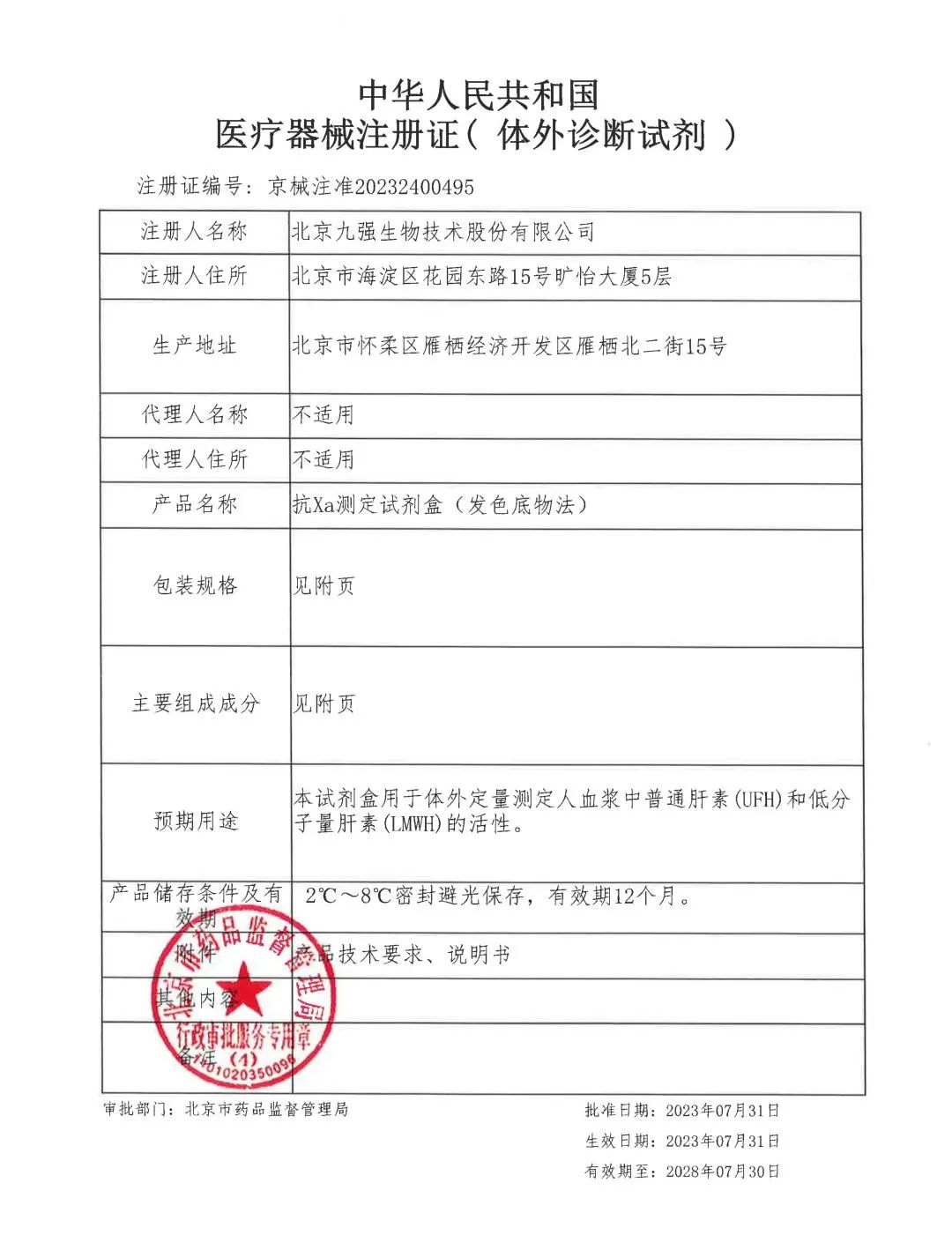 九強生物抗Xa(發色底物法)順利取得北京市藥品監督管理局頒發的《醫療器械注冊證》。