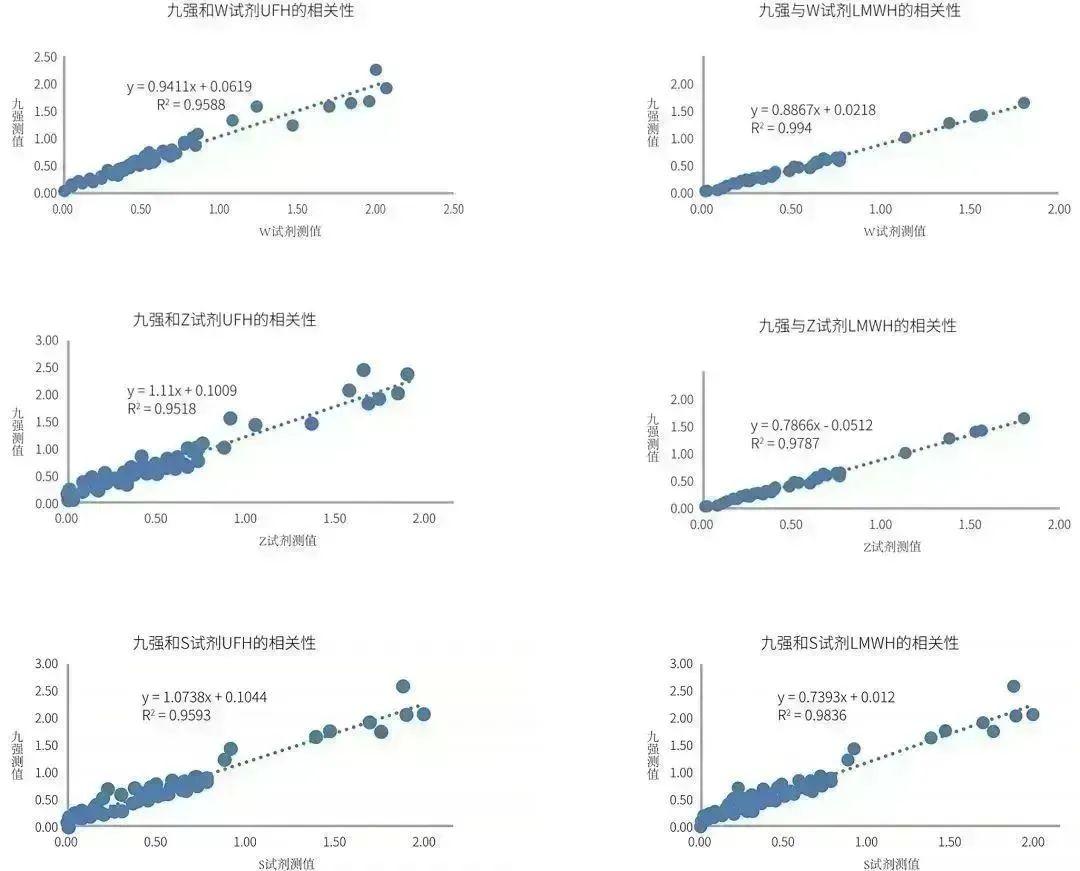 (1)國產抗Xa和對照試劑的測值的相關性良好:無論是普通肝素還是低分子肝素,測值相關性均在R2>0.95,可滿足臨床檢測需求;
