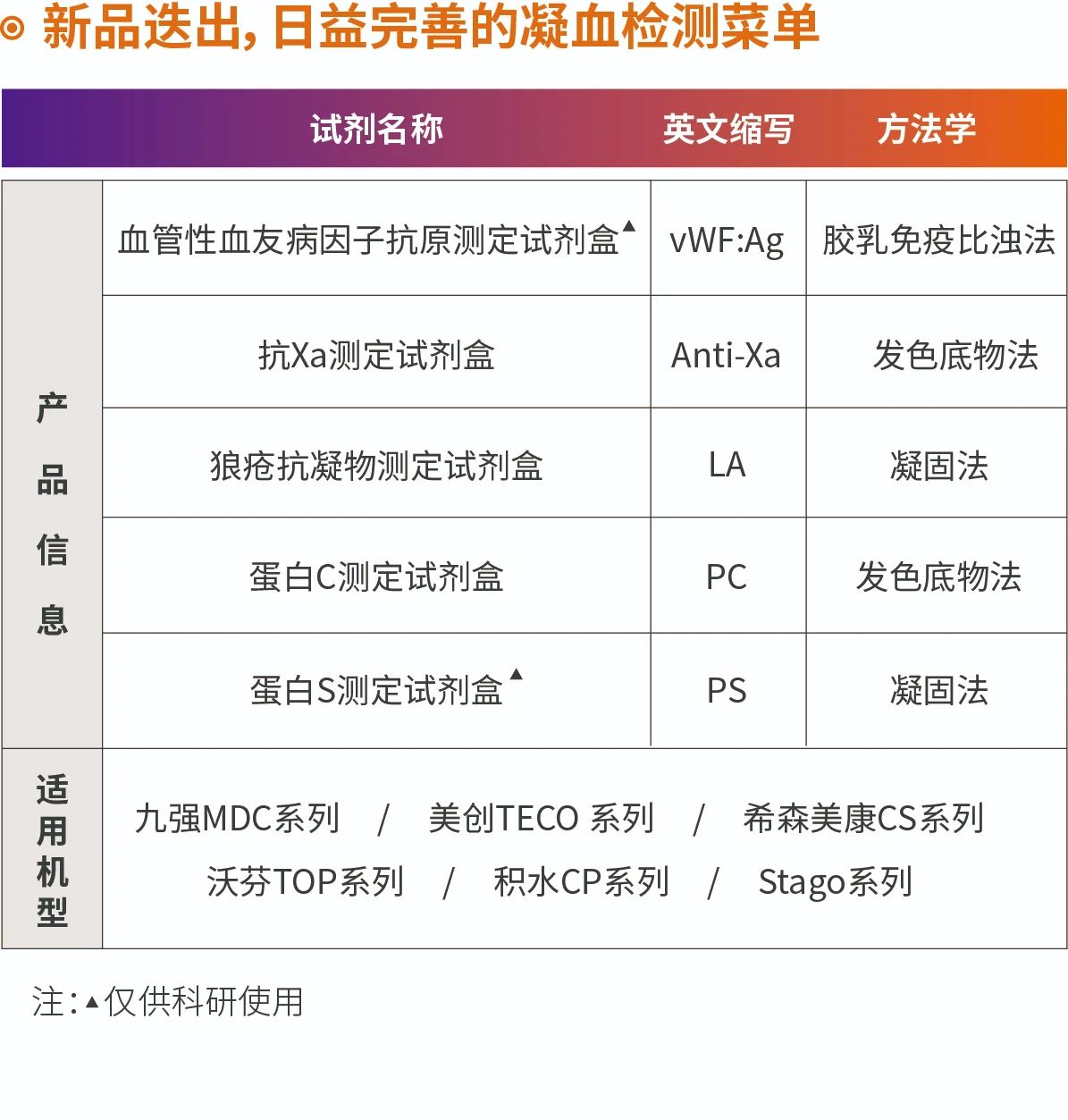 抗Xa活性試驗可用于UFH、LMWH、磺達肝癸鈉、直接FXa抑制劑等多種藥物抗凝強度/血藥濃度的測定。