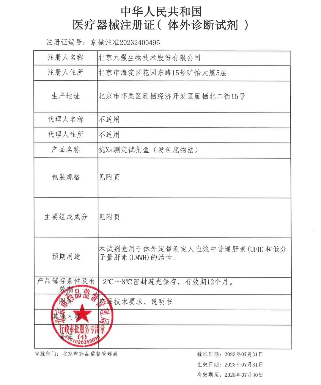 九強生物抗Xa(發色底物法)順利取得北京市藥品監督管理局頒發的《醫療器械注冊證》。