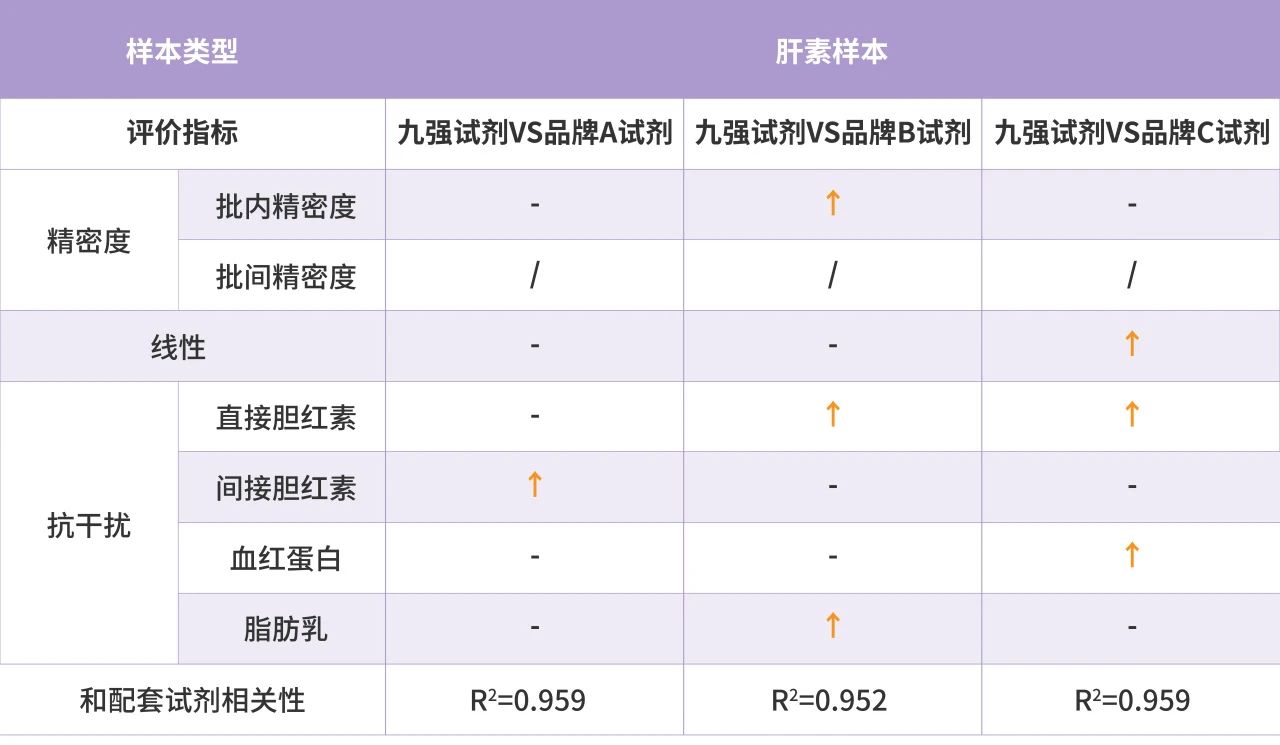 九強直接膽紅素可以做到10mg/dl,血紅蛋白可以做到125mg/dl,而對照試劑分別只能做到5mg/dl和不到125mg/dl,在直接膽紅素和血紅蛋白的抗干擾方面均優于原裝配套試劑。