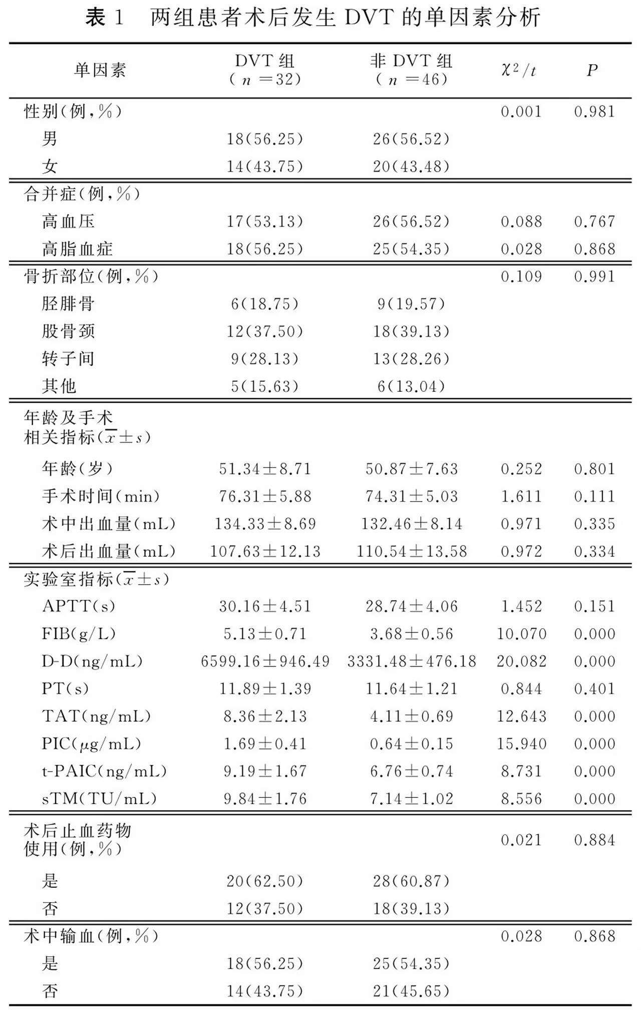 兩組患者性別、年齡、合并癥、骨折部位、手術時間、術中出血量、術后出血量、APTT、PT、術后止血藥物使用、術中輸血比較,差異無統計學意義(P>0.05),DVT組FIB、D-D、TAT 、PIC、t-PAIC、sTM 顯著高于非 DVT組,差異有統計學意義(P<0.05),見表1。