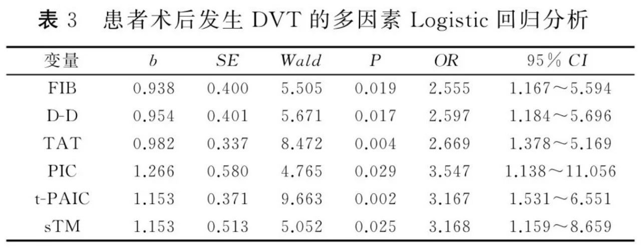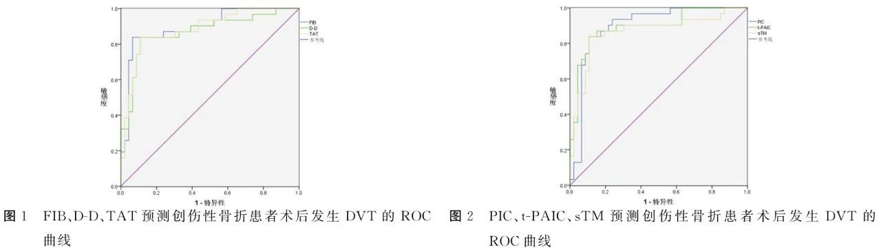 本次研究顯示,DVT組FIB、D-D、TAT、PIC、t-PAIC、sTM 顯著高于非DVT組,提示FIB、D-D、TAT、PIC、t-PAIC、STM可能與創傷性骨折患者術后DVT風險有關。