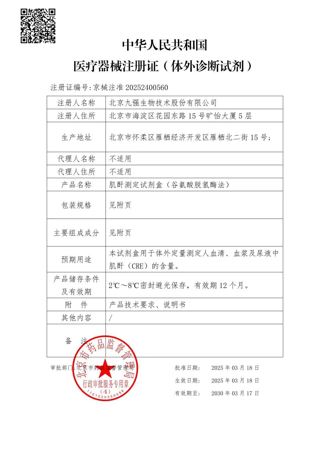 近日,九強(qiáng)生物肌酐測(cè)定試劑盒(谷氨酸脫氫酶法)順利取得北京市藥品監(jiān)督管理局頒發(fā)的《醫(yī)療器械注冊(cè)證》。