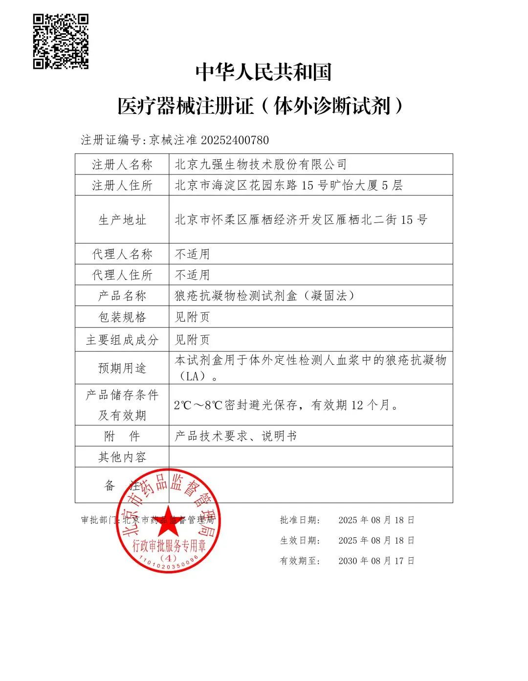 近日,九強生物狼瘡抗凝物檢測試劑盒(凝固法)順利取得國家藥品監督管理局頒發的《醫療器械注冊證》(注冊證號:京械注準 20252400780)。