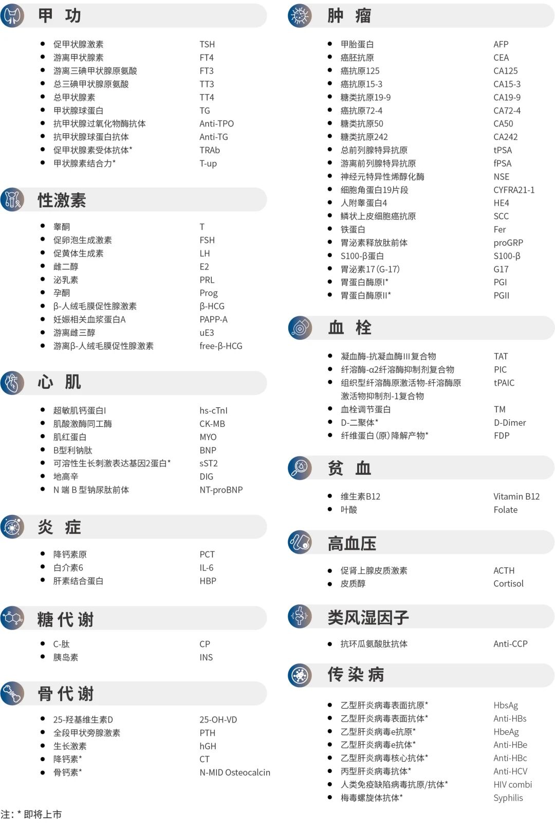 · 覆蓋全面:腫標(biāo)、甲功、心肌、炎癥、性激素、糖代謝等常規(guī)項(xiàng)目