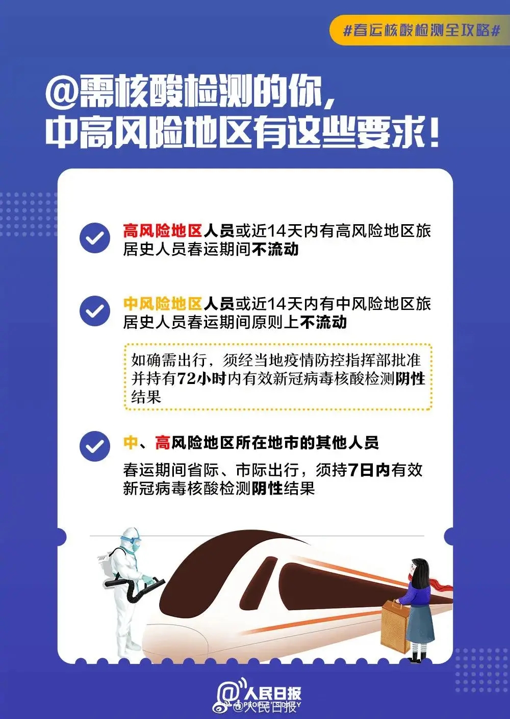 今天是2021春運第1天。高中低風險地區有哪些具體要求?什么情況需要做核酸檢測?如何預約?核酸檢測必知注意事項有哪些?**要求↓↓有用,擴散周知!